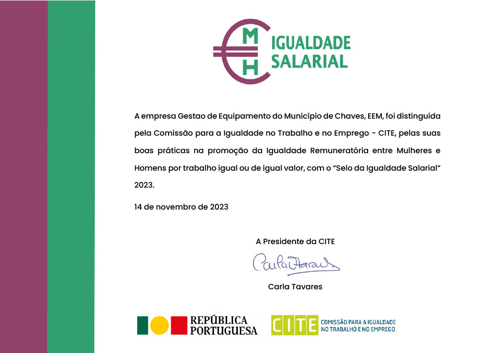 Dia 14 de novembro, assinala-se o Dia Nacional da Igualdade Salarial. Em Portugal, as mulheres ainda ganham, em média, menos 13,1% do que os homens. Temos de acelerar a Igualdade Salarial. É com satisfação que vos comunicamos que a empresa Gestao de Equipamento do Município de Chaves, EEM foi distinguida pela Comissão para a Igualdade no Trabalho e no Emprego – CITE, pelas suas boas práticas na promoção da Igualdade Remuneratória entre Mulheres e Homens por trabalho igual ou de igual valor, com o “Selo da Igualdade Salarial” 2023. Este reconhecimento é um testemunho do compromisso contínuo com a igualdade de género e a eliminação das disparidades salariais.